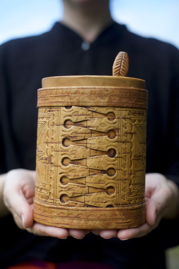 1. Tampad burk i helnäver, tillverkad av Bror Forslund, med den ornamentik som tros ha kommit från Ryssland till Uppland med en före detta krigsfånge i mitten av 1700-talet. Tamp är ett sätt att foga samman näver, vanligen använt i burkar.