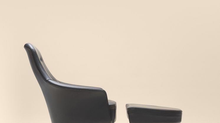 Fåtölj ”Stor Adam” med fotpall ”Fikonlövet” i svart skinn, formgivna av Kerstin Hörlin-Holmquist på 1950-talet. Fåtöljen och fotpallen var en del av möbelfamiljen Paradiset som ingick i NK:s Triva-serie.