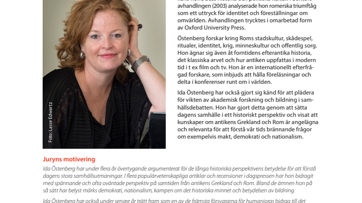 Ida Östenberg har under flera år övertygande argumenterat för de långa historiska perspektivens betydelse för att förstå dagens stora samhällsutmaningar. I flera populärvetenskapliga artiklar och recensioner i dagspressen har hon bidragit med spännande och ofta oväntade perspektiv på samtiden från antikens Grekland och Rom. Bland de ämnen hon på så sätt har belyst märks demokrati, nationalism, kampen om det historiska minnet och betydelsen av bildning.