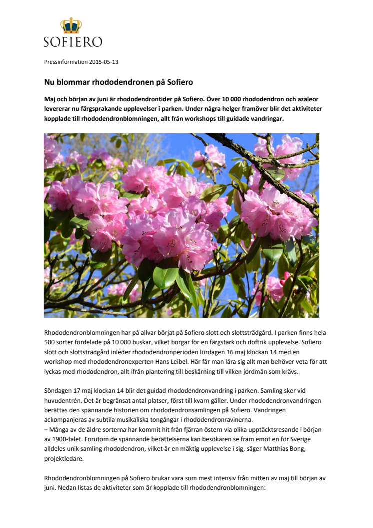 Maj och början av juni är rhododendrontider på Sofiero. Över 10 000 rhododendron och azaleor levererar nu färgsprakande upplevelser i parken. Under några helger framöver blir det aktiviteter kopplade till rhododendronblomningen, allt från workshops till guidade vandringar.