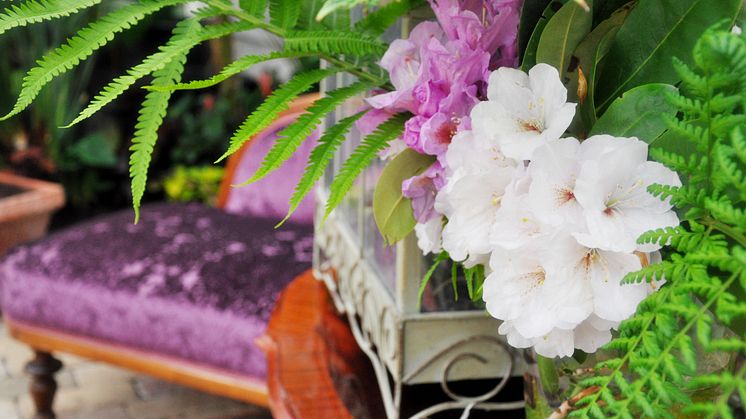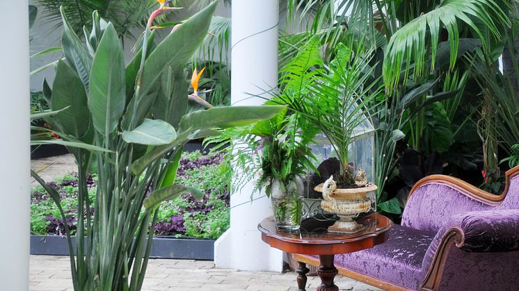 Sofieros trädgårdsdesigner Sara Bratt har utforskat 1800-talets stilideal och skruvat dem lite extra till en vacker och dramatisk 1800-talssalong. I Orangeriet kan man njuta av tjusiga möbler och exotiska växter.