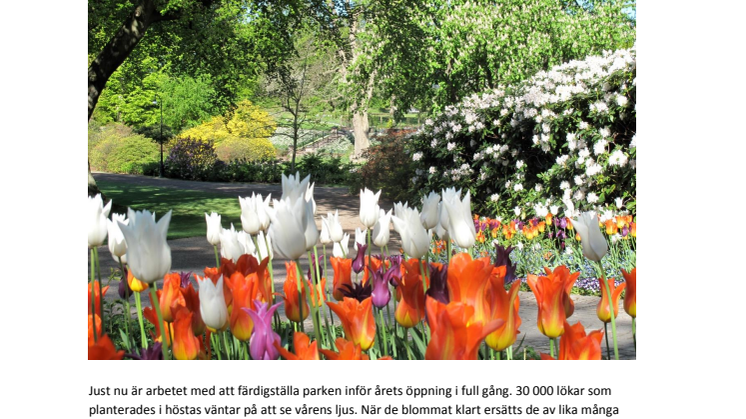 Just nu är arbetet med att färdigställa parken inför årets öppning i full gång. 30 000 lökar som planterades i höstas väntar på att se vårens ljus. När de blommat klart ersätts de av lika många sommarblommor. Annika Malmgren, platschef på Sofiero, utlovar en spännande säsong med stor variation både i blomsterprakt och i utställningar: