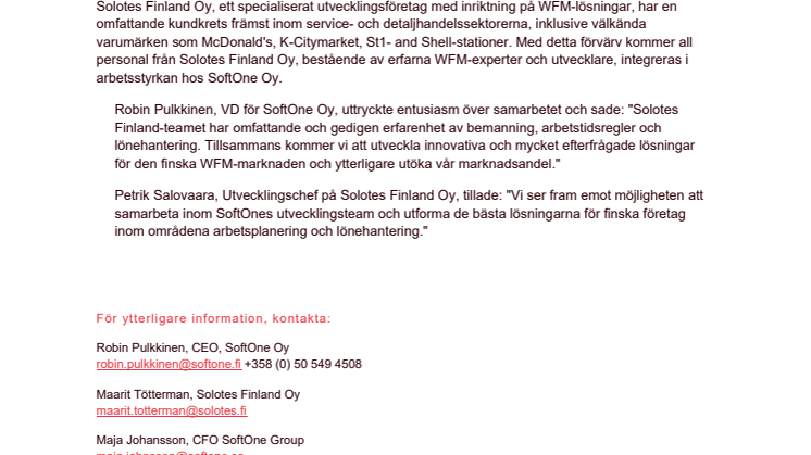 Solotes Finland Oy, ett specialiserat utvecklingsföretag med inriktning på WFM-lösningar, har en omfattande kundkrets främst inom service- och detaljhandelssektorerna, inklusive välkända varumärken som McDonald's, K-Citymarket, St1- and Shell-stationer. Med detta förvärv kommer all personal från Solotes Finland Oy, bestående av erfarna WFM-experter och utvecklare, integreras i arbetsstyrkan hos SoftOne Oy.