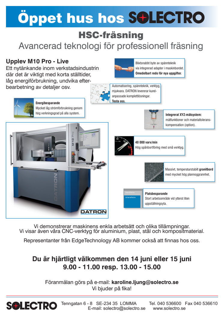 Öppet Hus hos Solectro AB 14:e -15:e Juni. Vi kommer att visa flera olika arbetssätt och fräsmoment som visar den nya tekniken som DATRON M10 Pro arbetar med. DATRON M10 Pro står för nytänkande inom verkstadsindustrin. Det är enkelt och lönsamt att köra både små och stora serier. Lönsamhet uppnås redan vid första detaljen!