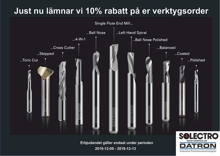 Just nu lämnar vi 10% på DATRONs fräsverktyg , gäller endast under perioden 4-7 Mars 2025