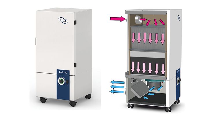 Med ett utsug från ULT är det enkelt att ansluta ett utsug med rätt anpassade filter för de olika ämnena som frigörs. Fångar man inte upp gasen och de små partiklarna redan vid källan eller bredvid så tar de sig vidare ut i lokalen och vidare till våra lungor och sedan ut i blodet som pumpas runt i våra olika organ.