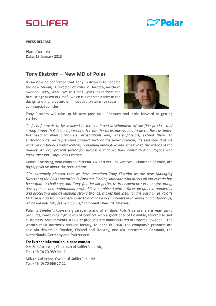It can now be confirmed that Tony Ekström is to become the new Managing Director of Polar in Dorotea, northern Sweden. Tony, who lives in Umeå, joins Polar from the firm Isringhausen in Umeå, which is a market leader in the design and manufacture of innovative systems for seats in commercial vehicles.