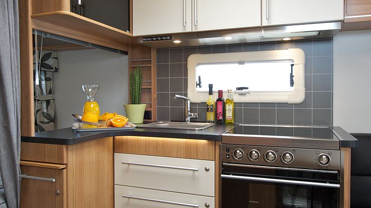 Det ljusa laminatet på matbordet är standard på 2013 års modeller. Den som önskar kan istället välja mörkt laminat som tillval eller också en ny, lyxigare och tjockare bordsskiva i ljust laminat med en gedigen träram. Behövs extra avställningsyta kan man oberoende av bänkskiva välja till ett utdrag på denna. En rad nya tyger till dynor och gardiner skänker ytterligare möjligheter att skapa en personlig vagn.