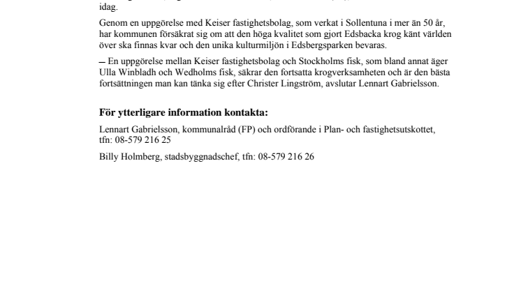 Genom en uppgörelse med Keiser fastighetsbolag, som verkat i Sollentuna i mer än 50 år, har kommunen försäkrat sig om att den höga kvalitet som gjort Edsbacka krog känt världen över ska finnas kvar och den unika kulturmiljön i Edsbergsparken bevaras.