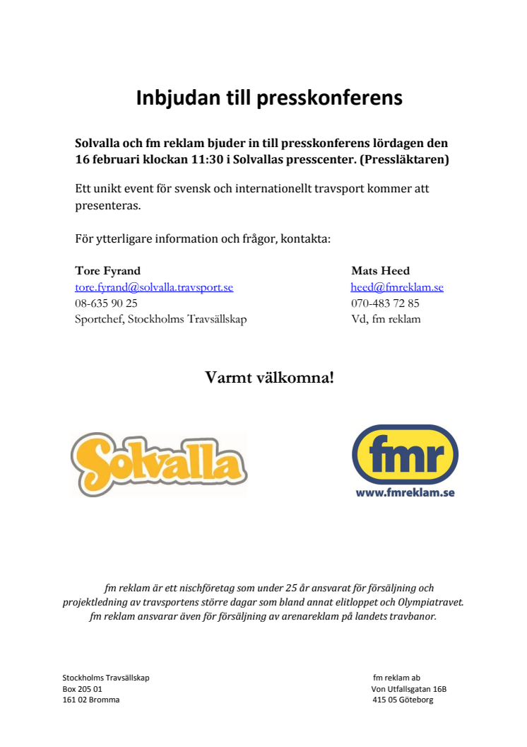 Solvalla och fm reklam bjuder in till presskonferens lördagen den 16 februari klockan 11:30 i Solvallas presscenter. (Pressläktaren)
