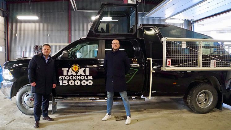 Taxi Stockholms marknadschef Thomas Bäckström (tv) och Solvallas försäljningschef Erik Hall (th) poserar framför Solvallas startbil.