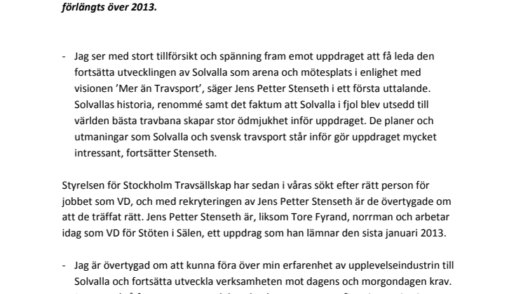 Jens Petter Stenseth har rekryterats som ny VD för Solvalla Travbana. Han tillträder under vintern 2013. Samtidigt har kontraktet med nuvarande VD Tore Fyrand förlängts över 2013.