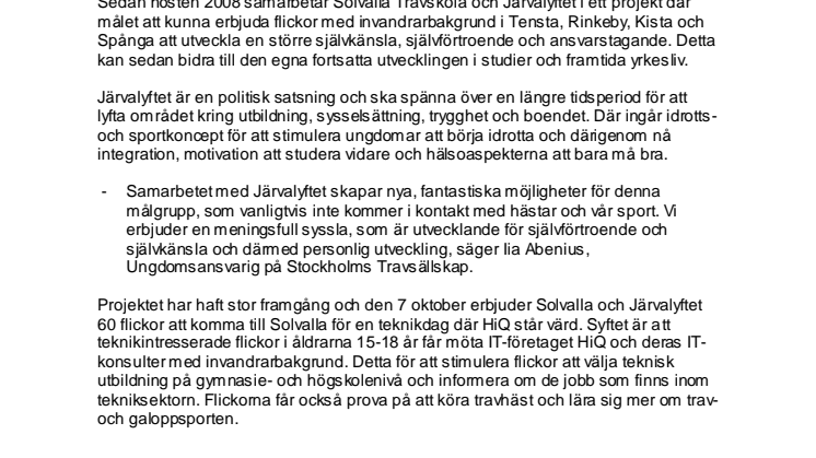 Sedan hösten 2008 samarbetar Solvalla Travskola och Järvalyftet i ett projekt där målet att kunna erbjuda flickor med invandrarbakgrund i Tensta, Rinkeby, Kista och Spånga att utveckla en större självkänsla, självförtroende och ansvarstagande. Detta kan sedan bidra till den egna fortsatta utvecklingen i studier och framtida yrkesliv.