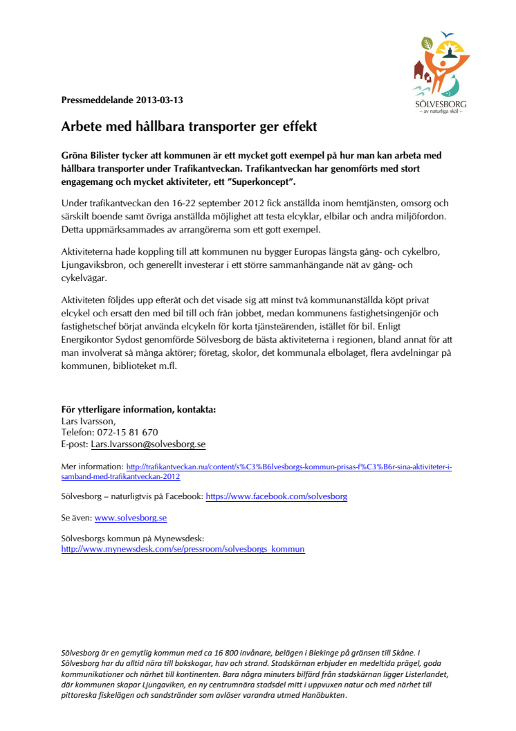 Gröna Bilister tycker att kommunen är ett mycket gott exempel på hur man kan arbeta med hållbara transporter under Trafikantveckan. Trafikantveckan har genomförts med stort engagemang och mycket aktiviteter, ett ”Superkoncept”.