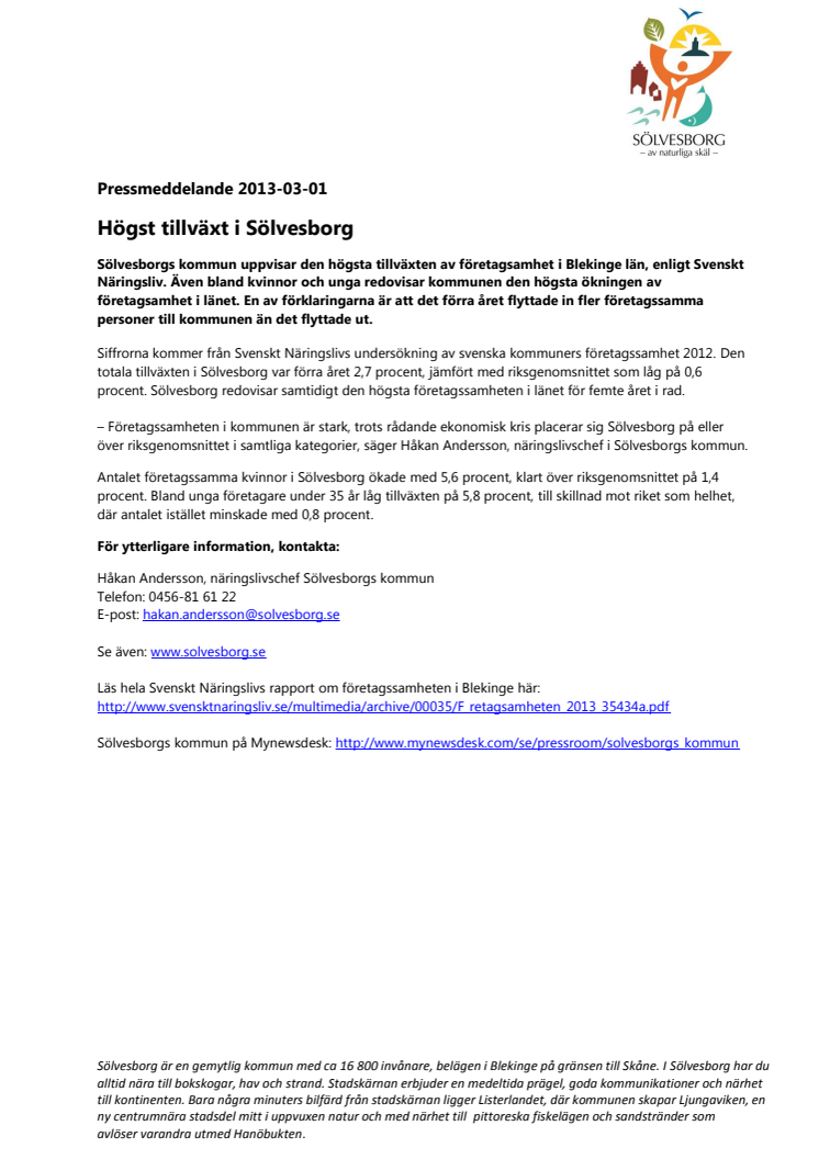 Sölvesborgs kommun uppvisar den högsta tillväxten av företagsamhet i Blekinge län, enligt
