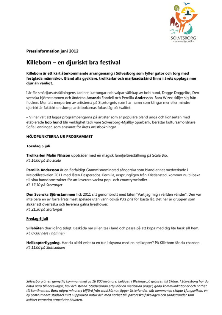 Killebom är ett kärt återkommande arrangemang i Sölvesborg som fyller gator och torg med festglada människor. Bland alla gycklare, trollkarlar och marknadsstånd finns i årets upplaga mer djur än vanligt.