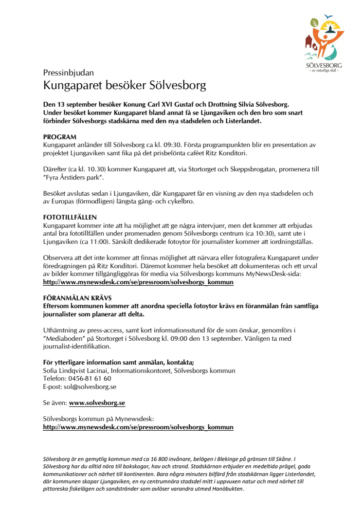 Den 13 september besöker Konung Carl XVI Gustaf och Drottning Silvia Sölvesborg. Under besöket kommer Kungaparet bland annat få se Ljungaviken och den bro som snart förbinder Sölvesborgs stadskärna med den nya stadsdelen och Ljungaviken.