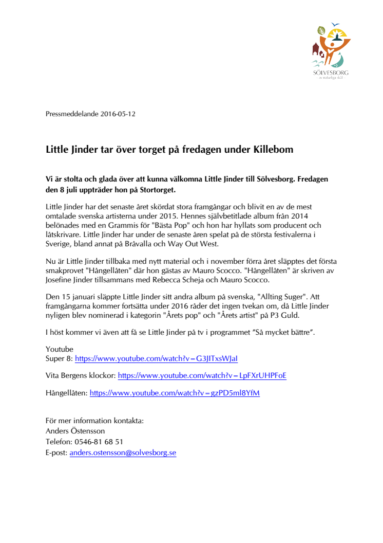 Vi är stolta och glada över att välkomna Little Jinder till Sölvesborg. Fredagen den 8 juli uppträder hon på Stortorget.