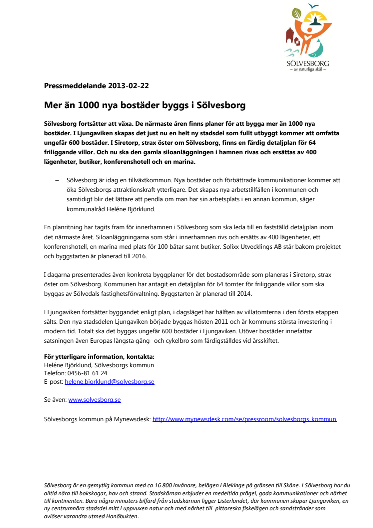 Sölvesborg fortsätter att växa. De närmaste åren finns planer för att bygga mer än 1000 nya bostäder. I Ljungaviken skapas det just nu en helt ny stadsdel som fullt utbyggt kommer att omfatta ungefär 600 bostäder. I Siretorp, strax öster om Sölvesborg, finns en färdig detaljplan för 64 friliggande villor. Och den gamla siloanläggningen i hamnen rivs och ersätts av bland annat 400 lägenheter.