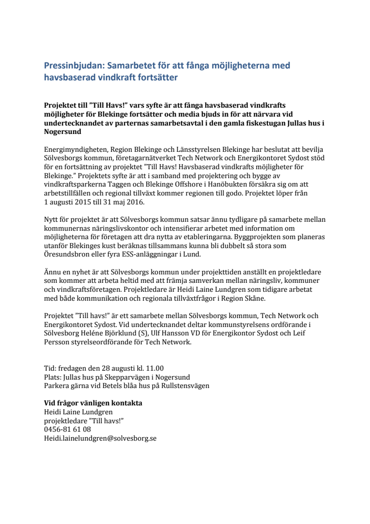 Projektet till ”Till Havs!” vars syfte är att fånga havsbaserad vindkrafts möjligheter för Blekinge fortsätter och media bjuds in för att närvara vid undertecknandet av parternas samarbetsavtal i den gamla fiskestugan Jullas hus i Nogersund.