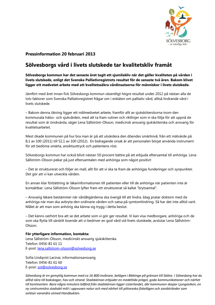 Sölvesborgs kommun har det senaste året tagit ett sjumilakliv när det gäller kvaliteten på vården i livets slutskede, enligt det Svenska Palliativregistrets resultat för de senaste två åren. Bakom klivet ligger ett medvetet arbete med att kvalitetssäkra vårdinsatserna för personer i livets slutskede.