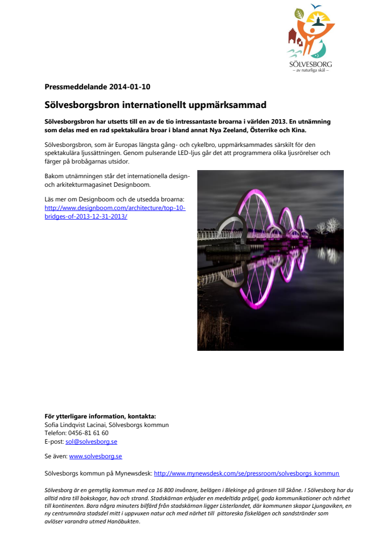 Sölvesborgsbron har utsetts till en av de tio intressantaste broarna i världen 2013. En utnämning som delas med en rad spektakulära broar i bland annat Nya Zeeland, Österrike och Kina.