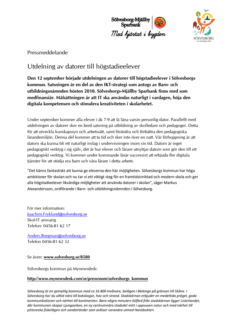 Den 12 september började utdelningen av datorer till högstadieelever i Sölvesborgs kommun. Satsningen är en del av den IKT-strategi som antogs av Barn- och utbildningsnämnden hösten 2010. Sölvesborgs-Mjällby Sparbank finns med som medfinansiär. Målsättningen är att IT ska användas naturligt i vardagen, höja den digitala kompetensen och stimulera kreativiteten i skolarbetet.