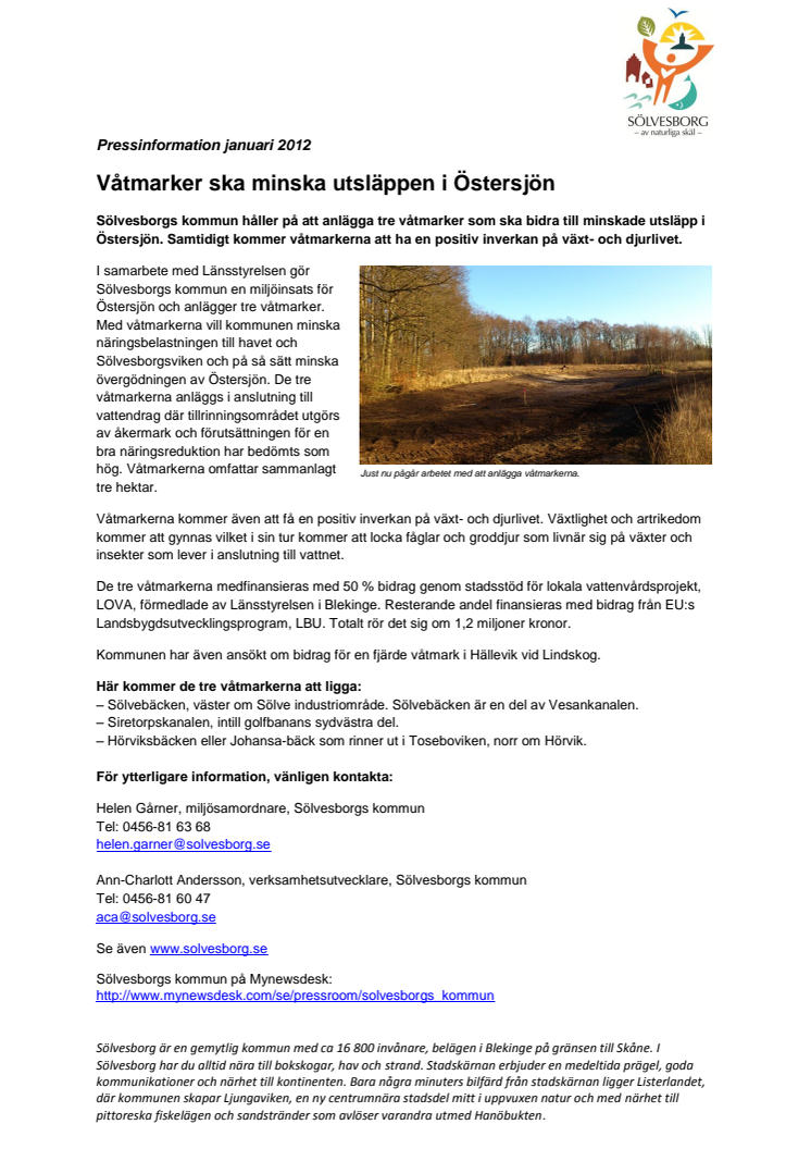 Sölvesborgs kommun håller på att anlägga tre våtmarker som ska bidra till minskade utsläpp i Östersjön. Samtidigt kommer våtmarkerna att ha en positiv inverkan på växt- och djurlivet.