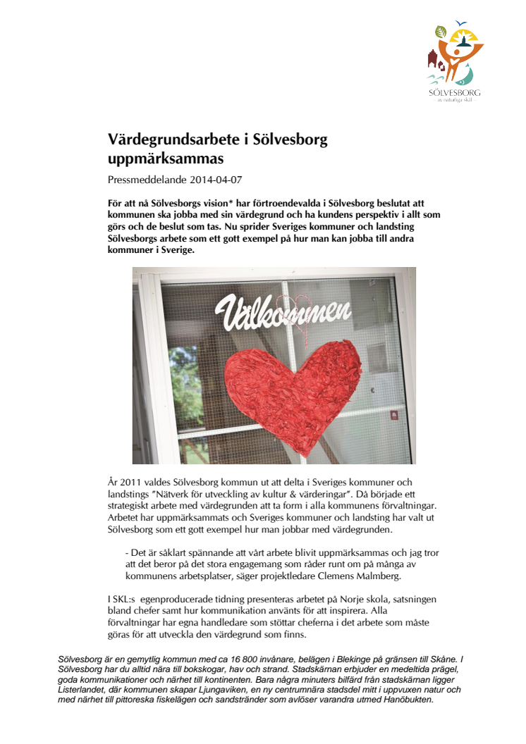 För att nå Sölvesborgs vision* har förtroendevalda i Sölvesborg beslutat att kommunen ska jobba med sin värdegrund och ha kundens perspektiv i allt som görs och de beslut som tas. Nu sprider Sveriges kommuner och landsting Sölvesborgs arbete som ett gott exempel på hur man kan jobba till andra kommuner i Sverige.