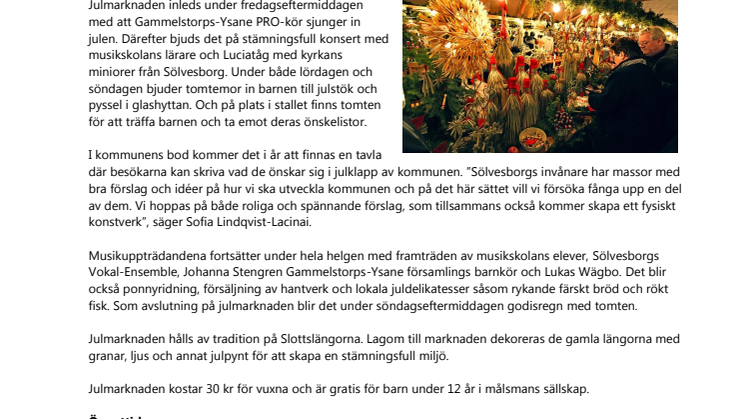 Imorgon fredag inleds årets julmarknad i Slottslängorna. Programmet är fullspäckat och bjuder bland annat på julstök för barnen, musikframträdanden och försäljning av lokala delikatesser. Nytt för i år är också önsketavlan där besökarna kan skriva vad de tycker är viktigt och vad de önskar sig av kommunen.