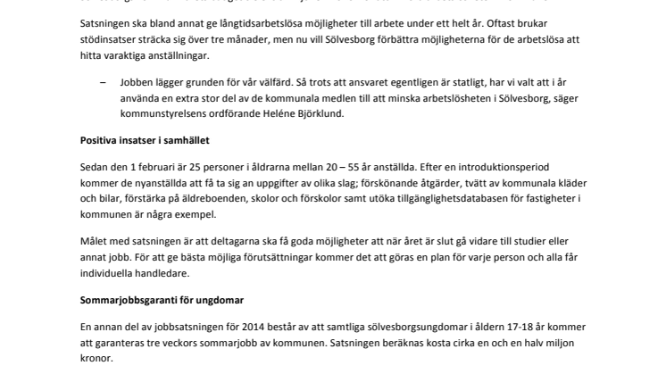 – Jobben lägger grunden för vår välfärd. Så trots att ansvaret egentligen är statligt, har vi valt att i år använda en extra stor del av de kommunala medlen till att minska arbetslösheten i Sölvesborg, säger kommunstyrelsens ordförande Heléne Björklund.