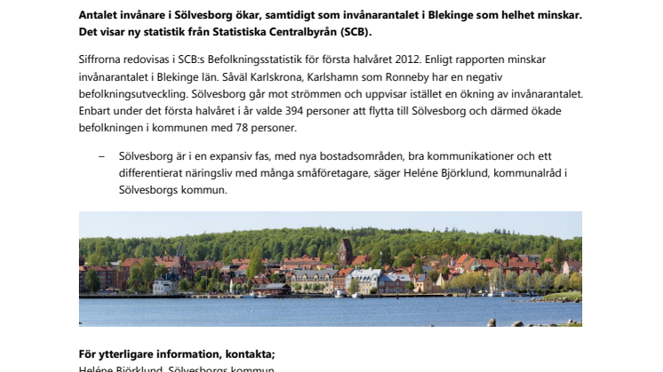 Siffrorna redovisas i SCB:s Befolkningsstatistik för första halvåret 2012. Enligt rapporten minskar invånarantalet i Blekinge län. Såväl Karlskrona, Karlshamn som Ronneby har en negativ befolkningsutveckling. Sölvesborg går mot strömmen och uppvisar istället en ökning av invånarantalet. Enbart under det första halvåret i år valde 394 personer att flytta till Sölvesborg och därmed ökade befolkningen i kommunen med 78 personer.