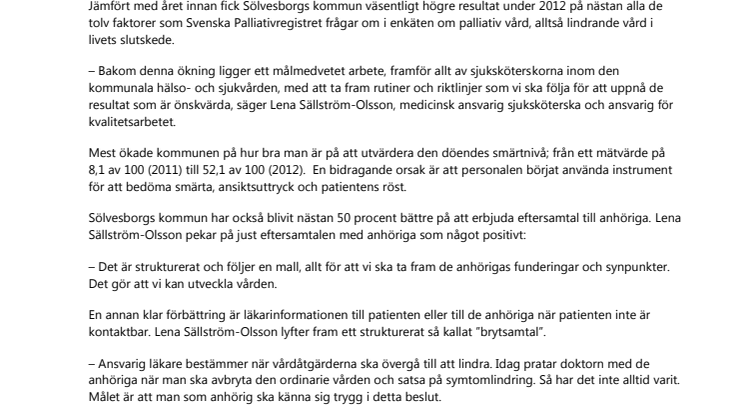 Jämfört med året innan fick Sölvesborgs kommun väsentligt högre resultat under 2012 på nästan alla de tolv faktorer som Svenska Palliativregistret frågar om i enkäten om palliativ vård, alltså lindrande vård i livets slutskede.