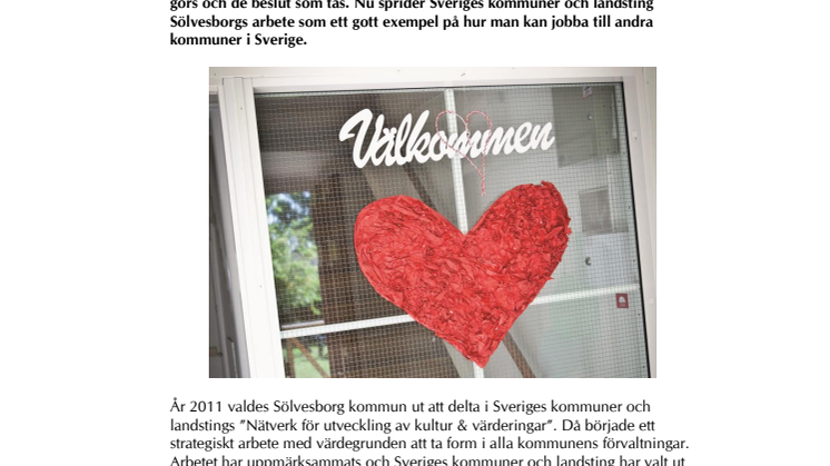 För att nå Sölvesborgs vision* har förtroendevalda i Sölvesborg beslutat att kommunen ska jobba med sin värdegrund och ha kundens perspektiv i allt som görs och de beslut som tas. Nu sprider Sveriges kommuner och landsting Sölvesborgs arbete som ett gott exempel på hur man kan jobba till andra kommuner i Sverige.
