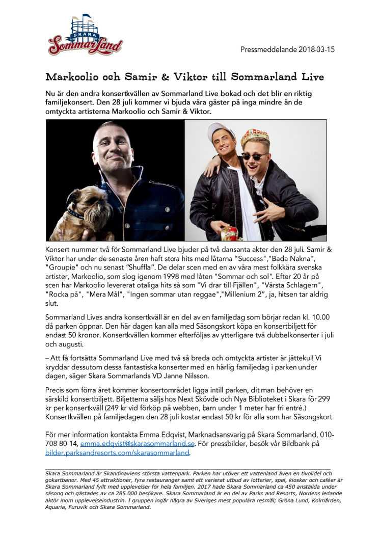 Nu är den andra konsertkvällen av Sommarland Live bokad och det blir en riktig familjekonsert. Den 28 juli kommer vi bjuda våra gäster på inga mindre än de omtyckta artisterna Markoolio och Samir & Viktor.