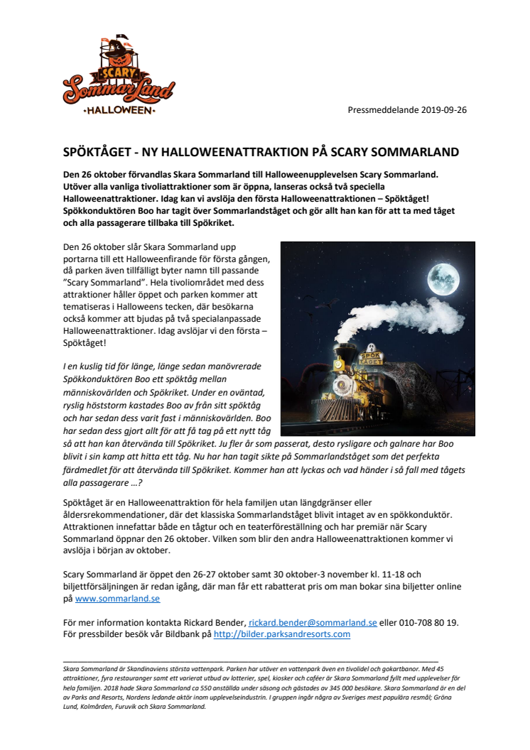 Den 26 oktober förvandlas Skara Sommarland till Halloweenupplevelsen Scary Sommarland. Utöver alla vanliga tivoliattraktioner som är öppna, lanseras också två speciella Halloweenattraktioner. Idag kan vi avslöja den första Halloweenattraktionen – Spöktåget! Spökkonduktören Boo har tagit över Sommarlandståget och gör allt han kan för att ta med tåget och alla passagerare tillbaka till Spökriket.