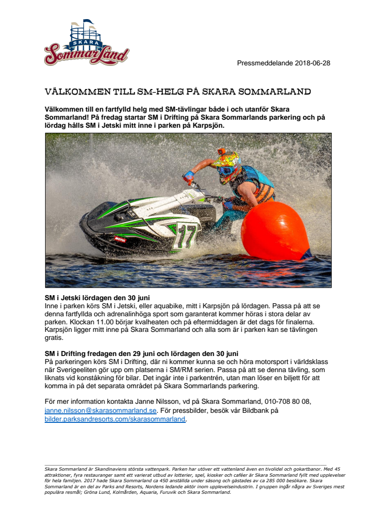 Välkommen till en fartfylld helg med SM-tävlingar både i och utanför Skara Sommarland! På fredag startar SM i Drifting på Skara Sommarlands parkering och på lördag hålls SM i Jetski mitt inne i parken på Karpsjön.