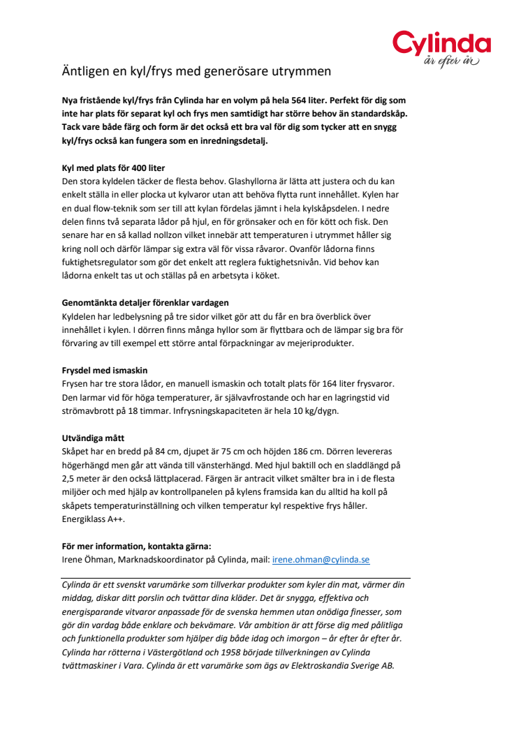Nya fristående kyl/frys från Cylinda har en volym på hela 564 liter. Perfekt för dig som inte har plats för separat kyl och frys men samtidigt har större behov än standardskåp. Tack vare både färg och form är det också ett bra val för dig som tycker att en snygg kyl/frys också kan fungera som en inredningsdetalj.