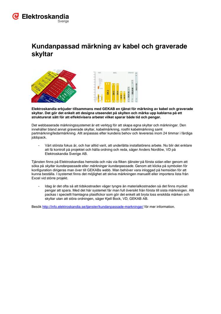 Elektroskandia erbjuder tillsammans med GEKAB en tjänst för märkning av kabel och graverade skyltar. Det gör det enkelt att designa utseendet på skylten och märka upp kablarna på ett strukturerat sätt för att effektivisera arbetet vilket sparar både tid och pengar.