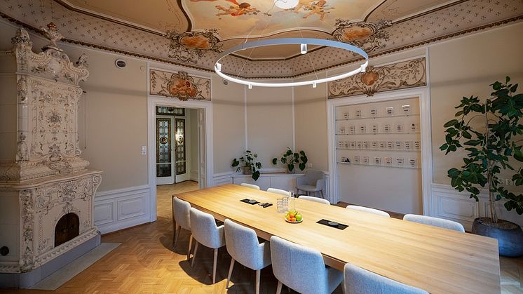 -I konferensrummet blev lösningen att använda Arena från Panzeri. Det är en mycket dekorativ, rund pendelarmatur med tunn ljusprofil med LED-list på insidan och justerbara spotlights runt om. Denna armatur lyser upp de vackra takmålningarna samtidigt som spotlights ger en bra arbetsbelysning.