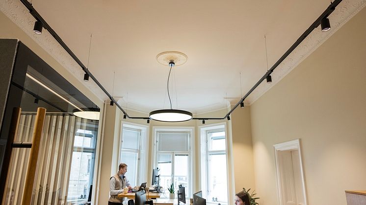 I de övriga kontorsrummen användes Mova från Molto Luce, spotlights på skena, kompletterat med Cardi-armaturen Cylli i centrum.