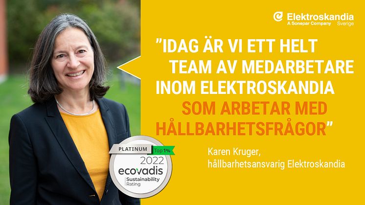 - Vi har kundkrav och för att se vad vi kan förbättra för framtiden, anlitar vi sedan några år tillbaka det oberoende analysföretaget Ecovadis. Deras bedömning av företag sker inom fyra områden: miljö, rättvisa och arbetsförhållanden, etik samt hållbara inköp. De hållbarhetsbetyg som Ecovadis delar ut är i nivåerna brons, silver, guld samt platina. Platina når endast 1 procent av alla rankade företag. Sedan vi började samarbetet har vi gradvis kunna höja vårt betyg för att nu nått upp till högsta nivå, platina. Vi är givetvis mycket stolta och glada över utmärkelsen, som visar att vi är på rätt väg och som också sporrar oss i vårt fortsatta hållbarhetsarbete, säger Karen Kruger, ansvarig för hållbarhet på Elektroskandia Sverige AB.