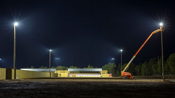 - I början av året levererade vi all materiel till Gettab och projektet på Tofta. När det gällde belysning så bestod leveransen bland annat av 9 stycken 16- och 18-meters stolpar från Scan Pole. Strålkastarna som valdes var Alos 1000 smal och Alos 1000 asymmetrisk från vårt eget sortiment Cardi. De här strålkastarna är riktigt starka, på nästan 1000w och ger 120 000 lumen. Totalt blev det 14 stycken Alos som monterades två och två i stolparna. Dessutom levererade vi även andra belysningsarmaturer från Cardi, bland annat Fakta till värmestugan, Fabo i väderskyddet och Doris på fasaden, säger Emma Lindblom.