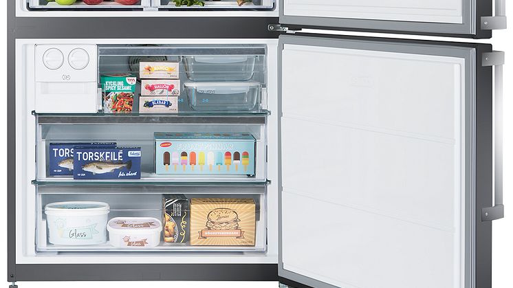 Den stora kyldelen täcker de flesta behov. Glashyllorna är lätta att justera och du kan enkelt ställa in eller plocka ut kylvaror utan att behöva flytta runt innehållet. Kylen har en dual flow-teknik som ser till att kylan fördelas jämnt i hela kylskåpsdelen. I nedre delen finns två separata lådor på hjul, en för grönsaker och en för kött och fisk. Den senare har en så kallad nollzon vilket innebär att temperaturen i utrymmet håller sig kring noll och därför lämpar sig extra väl för vissa råvaror. Ovanför lådorna finns fuktighetsregulator som gör det enkelt att reglera fuktighetsnivån. Vid behov kan lådorna enkelt tas ut och ställas på en arbetsyta i köket.