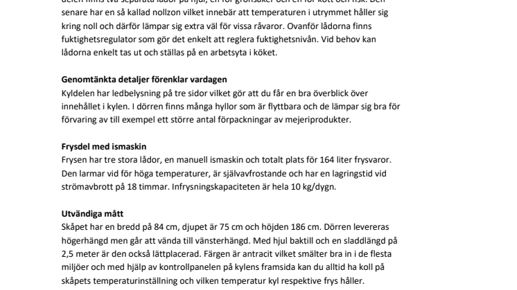 Frysen har tre stora lådor, en manuell ismaskin och totalt plats för 164 liter frysvaror. Den larmar vid för höga temperaturer, är självavfrostande och har en lagringstid vid strömavbrott på 18 timmar. Infrysningskapaciteten är hela 10 kg/dygn.