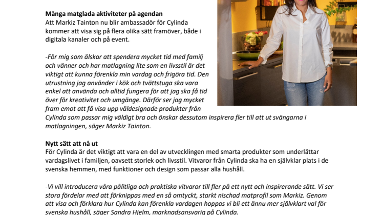 -För mig som älskar att spendera mycket tid med familj och vänner och har matlagning lite som en livsstil är det viktigt att kunna förenkla min vardag och frigöra tid. Den utrustning jag använder i kök och tvättstuga ska vara enkel att använda och alltid fungera för att jag ska få tid över för kreativitet och umgänge. Därför ser jag mycket fram emot att få visa upp väldesignade produkter från Cylinda som passar mig väldigt bra och önskar dessutom inspirera fler till att ta ut svängarna i matlagningen, säger Markiz Tainton.