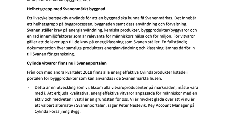 Från och med andra kvartalet 2018 finns alla energieffektiva Cylindaprodukter listade i portalen för byggprodukter som kan användas i de Svanenmärkta husen.