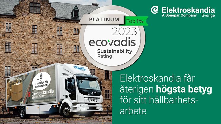 Det oberoende analysföretaget EcoVadis har för andra året i rad tilldelat Elektroskandia högsta möjliga betyg, platina, för företagets hållbarhetsarbete. Med det är man bland topp 1%, av de mer än 100 000 betygsatta företagen globalt.