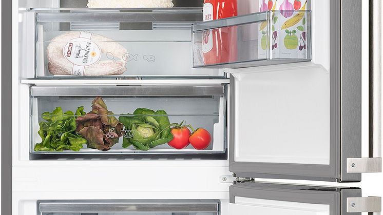 Genom ett vred reglerar du fuktigheten i lådan för grönsaker och kan därmed hålla dem fräscha längre. Flaskhyllan är generöst tilltagen för att hålla många drycker på plats och få dem väl kylda.
