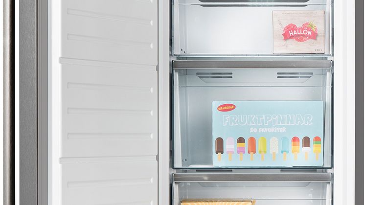 Frysen har generösa förvaringsutrymmen, tack vare rymliga lådor och två öppna hyllplan utan luckor, ett utrymme som ger ett luftigt intryck och god överblick. Med en liten manöver gör du iskuber till din kalla dryck eller barnens saftglas från den manuella ismaskinen i dörren, något som också skänker lyx åt vardagen. Frysen är väl upplyst genom väl placerade ledljuspunkter.